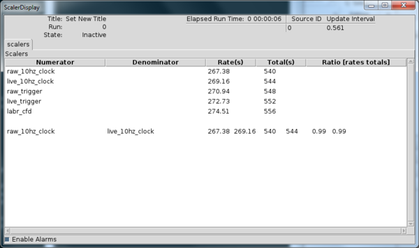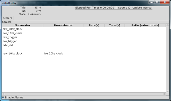 When the scaler data arrives into the ring buffer that was specified in SCALER_RING, the ScalerDisplay will show valid data. It will look something like this: