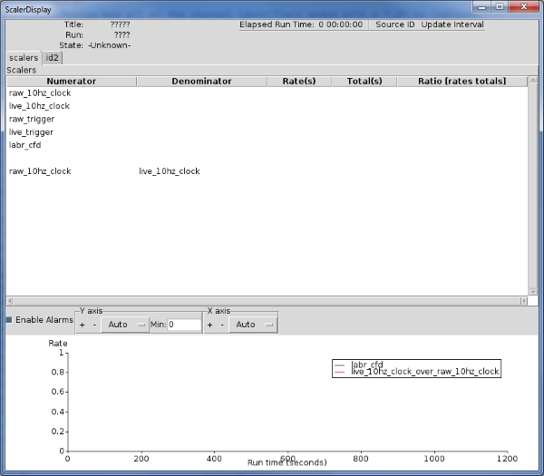 Done. Now let's make things more interesting. The ScalerDisplay provides a strip chart for monitoring the trends of the scaler values. You can register channels to be plotted on the strip chart using the stripparam and stripratio commands. The stripparam takes a single argument, the channel name, and the stripratio command takes two commands, the channel name of the numerator followed by the denominator. We will plot register the trend of the labr_cfd by itself as well as the ratio of our live time clocks. To do so, we add the following to our scaler.def file: