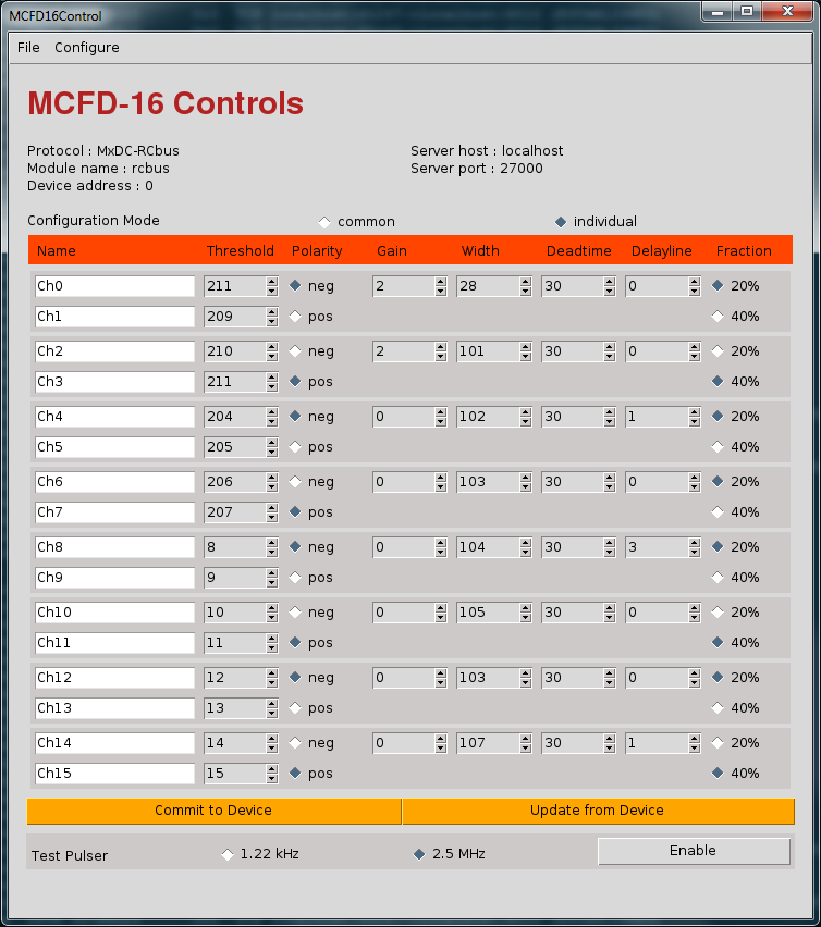 By default, this assumes that the --host is localhost, --port is 27000, and --devno is 0. The first two of these are probably correct unless other slow-controls servers are running. In which case, the user should determine the relevant information as described in the prior step. The device number (--devno) is the number of the device as it is identifiable by the RC-bus. For the MCFD-16, this is set via a switch on the back of the device.
