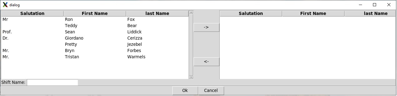 In this figure, the left list contains the list of people known to the logbook. You can select one or more of them and click the button to add those people to the shift. The list on the right contains the members of the shift you are building to this point. You can remove members from the shift by selecting them and clicking the . Finally, the entry at the lower left is where you should enter the shift's name. Click to attempt to create the shift and to abandon shift creation.