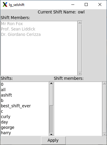 In the shift selector, the top part of the selector shows the current shift, if any, and a list of its members. The list box at the bottom left contains a list of the shifts that have been defined. Clicking one will list its members in the list box at the bottom right.