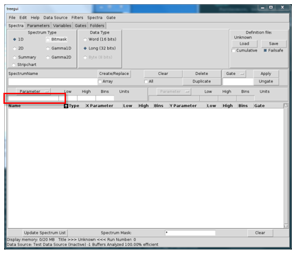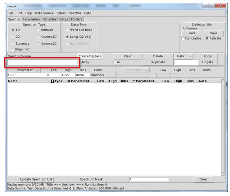 Next we need to give our histogram a name. Lacking any sense of creativity at the moment, I choose to name the histogram "t01". Enter this is the text entry below the label "SpectrumName". In the following figure I have hightlighted it in red.