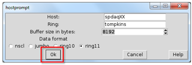 With a histogram created, we need to attach SpecTcl to a data stream. Let's assume that your Readout program is running and spewing out data. SpecTcl can be directed to attach to this "online" data stream by going to the "Data Sources" drop-down menu and selecting "Online...". A dialogue will pop up that will direct you to specify a ring buffer name. Let's assume that the ring name is "tompkins" and the ringbuffer lives on computer whose hostname is "spdaqXX". You can disregard the buffer size because it does not influence parsing when dealing with ring items. Instead, we will select that our data format is "ring11" to indicate that the data is in the 11.0 data format. At the end your dialogue should look something like this: