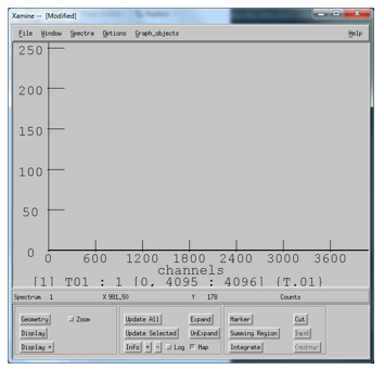 Press the "Display+" button and select a histogram to display. In my case, there is only a single histogram named "t01" to choose from. Click on the histogram name and press "Okay". The histogram should now be visible and Xamine should look something like this: