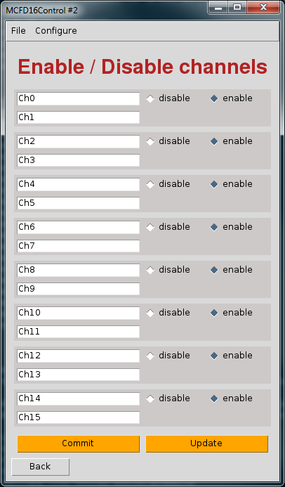 The output for channels can be disabled in the MCFD-16. Support for this feature is provided through the dialog at "Configure > Enable/disable..." It is important to realize that enabling and disabling a channel is done for channel pairs rather than individual channels. The same semantics apply to this dialog for committing settings to the module as for the rest of the application. You must press "Commit" to transfer the state of the GUI to the module. You can read the state of the module by pressing the "Update" button. Each commit operation is always followed by an update operation intrinsically so that you can see whether a change succeeded or failed.